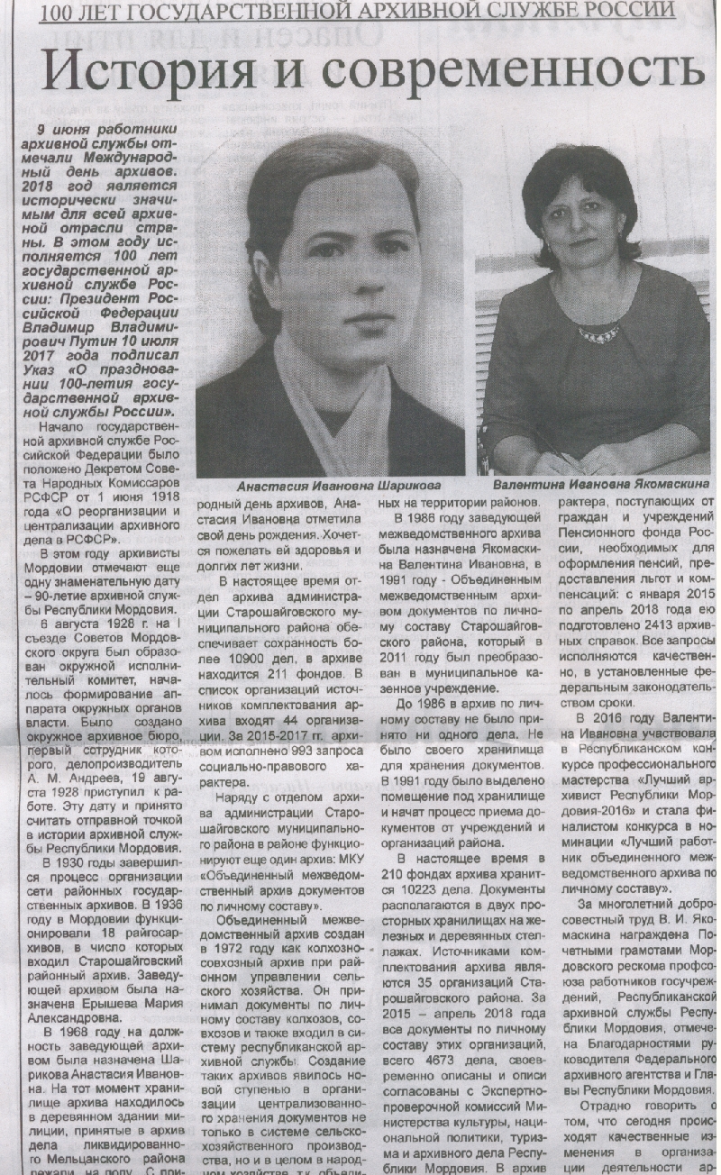 В 1930 годы завершился процесс организации сети районных государственных архивов. В 1936 году в Мордовии функционировали 18 райгосархивов, в число которых входил Старошайговский районный архив. Заведующей архивом была назначена Ерышева Мария Александровна.