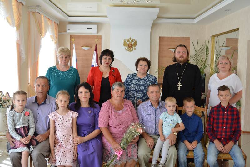 В этот прекрасный деньв районном отделе ЗАГС состоялось торжественное мероприятие, посвященное замечательному празднику - Дню семьи, любви и верности, на которое были приглашены супруги, прожившие вместе несколько десятков лет, известные крепостью семейных устоев, основанных на взаимной любви и верности, добившиеся благополучия, обеспеченного совместным трудом, воспитавшие своих детей достойными членами общества. Главными участниками торжества стали юбиляры семейной жизни супружеские пары Чегеревых - Николай Васильевич и Татьяна Ивановна, Демидовых – Андрей Яковлевич и Надежда Степановна и многодетные родители с детьми Котькины - Александр Серафимович и Ольга Евдокимовна.