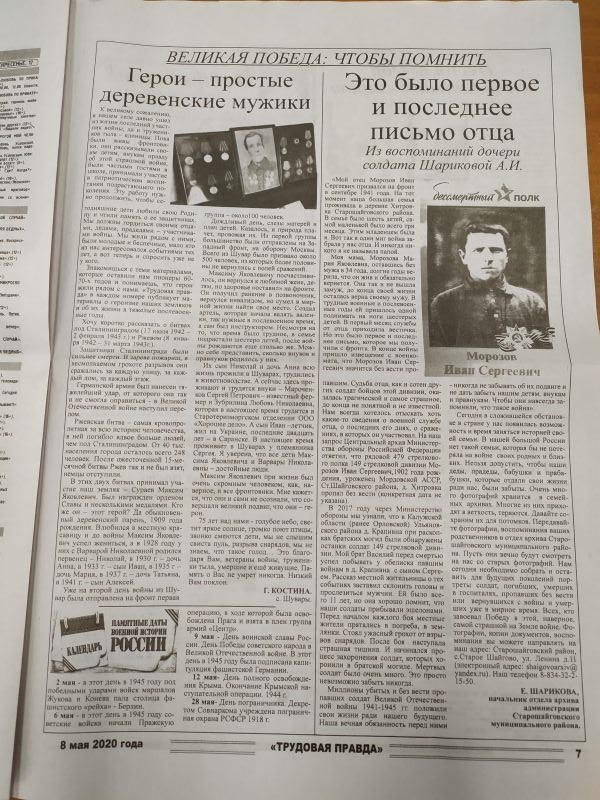 08.05.2020. Газета «Трудовая правда» К 75 летию Победы в Великой Отечественной войне 1941-1945гг. -Это было первое и последнее письмо отца