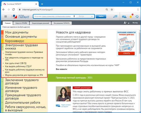 ШАГ 1. Откройте Страницу кадровика. В профессиональном меню целый раздел посвящен теме электронных трудовых книжек (далее - ЭТК). Раскройте его и перейдите по ссылке к материалу Энциклопедии решений Как уведомить сотрудника о переходе на ЭТК?