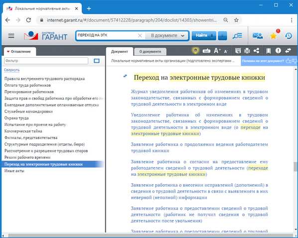 ШАГ 2. В строке Базового поиска введите переход на ЭТК и нажмите кнопку Найти. Среди первых документов списка выберите документ Локальные нормативные акты организации (подготовлено экспертами компании «Гарант»). Подборка сразу открылась на нужном разделе.