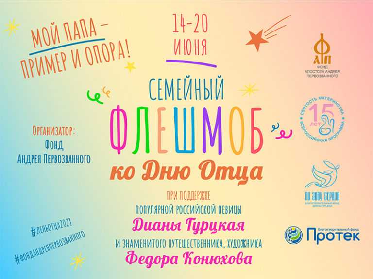 ГКУ «Социальная защита населения по Старошайговскому району Республики Мордовия» информирует, что с 14 по 20 июня 2021 года Фонд Андрея Первозванного при поддержке заслуженной артистки Российской Федерации, председателя Комиссии по доступной среде и развитию инклюзивных практик Общественной Палаты Российской Федерации Дианы Гурцкой и знаменитого путешественника, художника Фёдора Конюхова в социальных сетях (Instagram, Facebook, Одноклассники, ВКонтакте) проводит Всероссийский семейный флешмоб, приуроченный к празднику «День отца», в рамках которого предусмотрены призы от Фонда Андрея Первозванного и благотворительного фонда «Протек». Подведение итогов состоится 23 июня 2021 года в официальных сетях Фонда Андрея Первозванного и Дианы Гурцкой.