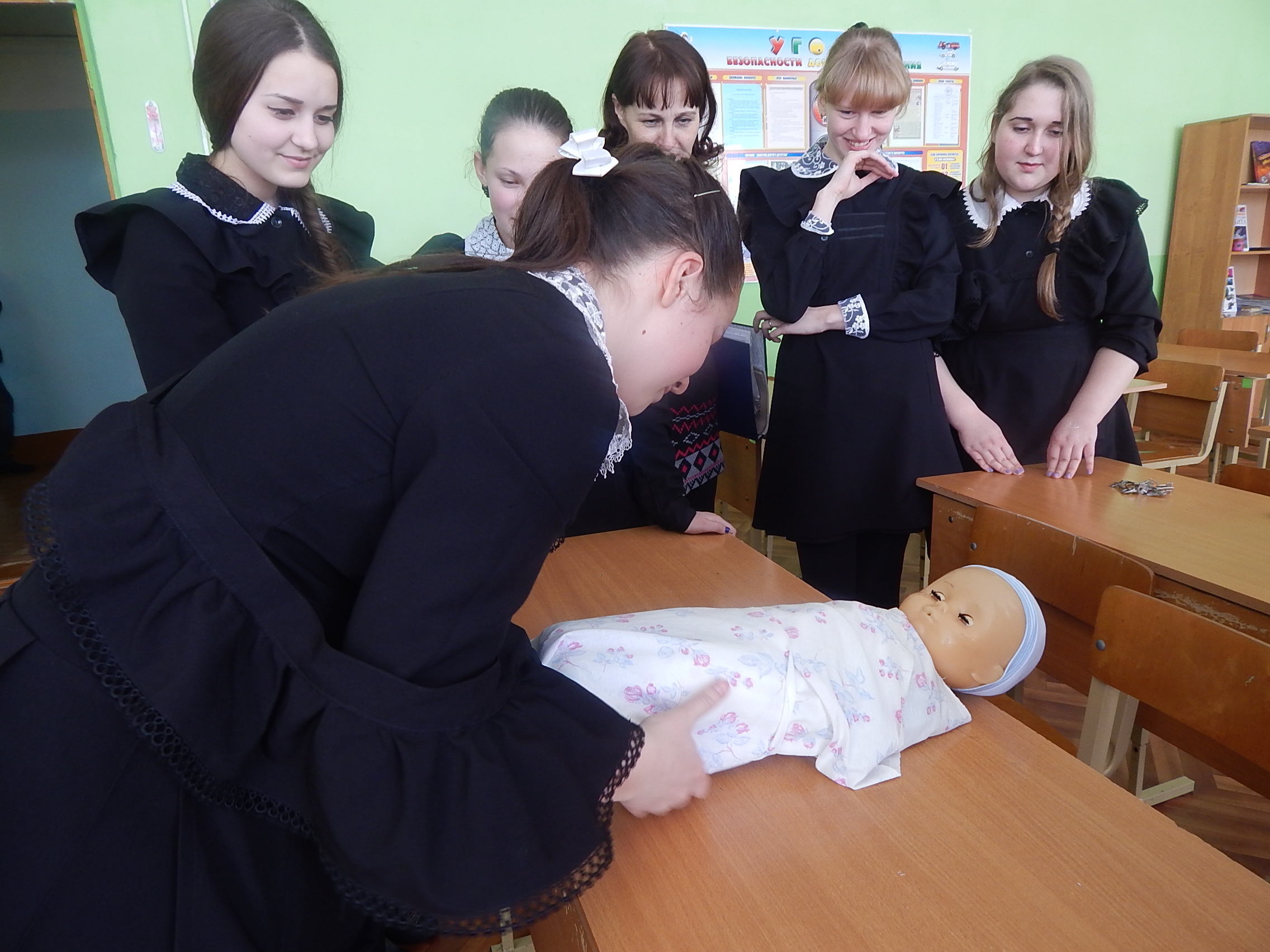 2. Станция «Лечебное дело» организованная ГБУЗ «Старошайговская РБ». Участковая медсестра педиатрического отделения познакомила учащихся с навыками оказания первой медицинской помощи, пеленания детей.