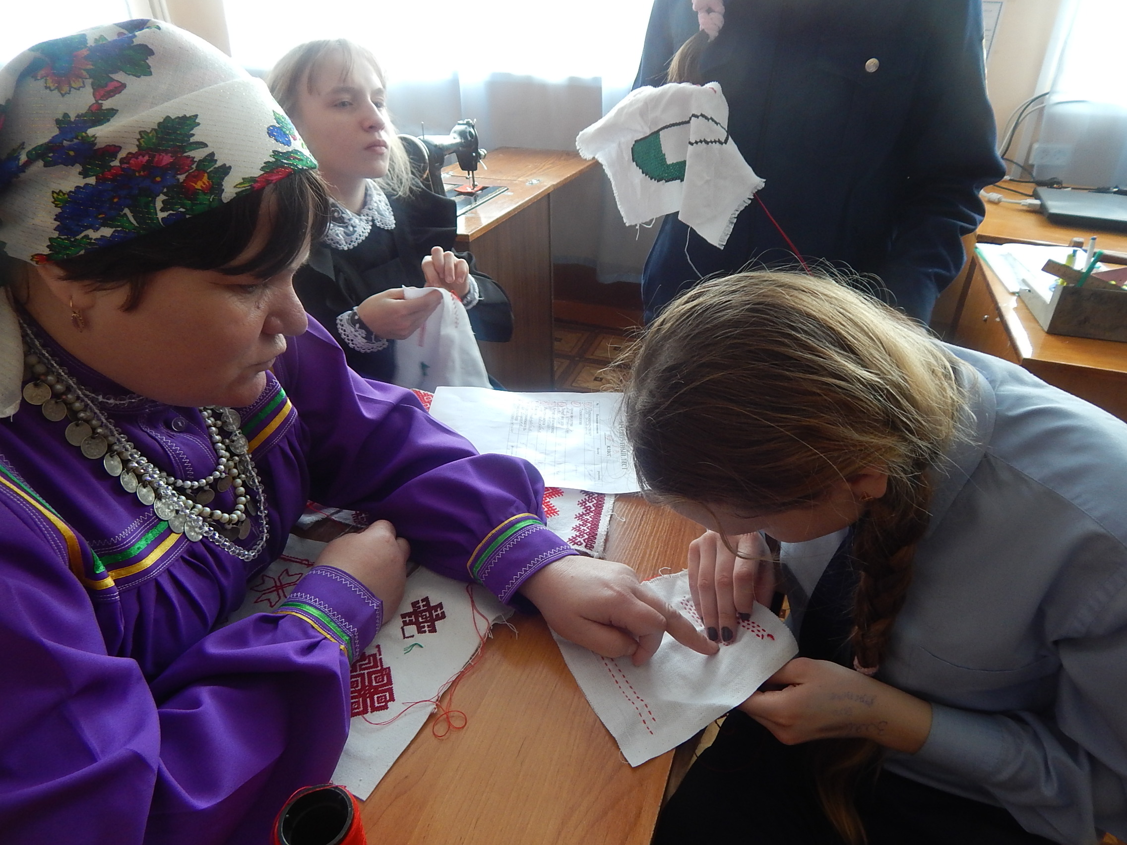 6. Станция «Рукодельница» была организована Видясовой Н.А. и Гераеськиной М.А. На данной станции учащиеся отрабатывали навыки вышивания, биссероплетения заготовок мордовских костюмов.