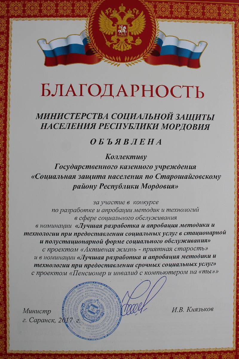 Коллективу ГКУ «Социальная защита населения по Старошайговскому району РМ» объявлена БЛАГОДАРНОСТЬ Министерства социальной защиты населения Республики Мордовия за участие в конкурсе по разработке и апробации методик и технологий в сфере социального обслуживания в номинации «Лучшая разработка и апробация методики и технологии при предоставлении социальных услуг в стационарной и полустационарной форме социального обслуживания» за проект «Активная жизнь – приятная старость» и в номинации «Лучшая разработка и апробация методики и технологии при предоставлении срочных социальных услуг» за проект «Пенсионер и инвалид с компьютером на «ты».